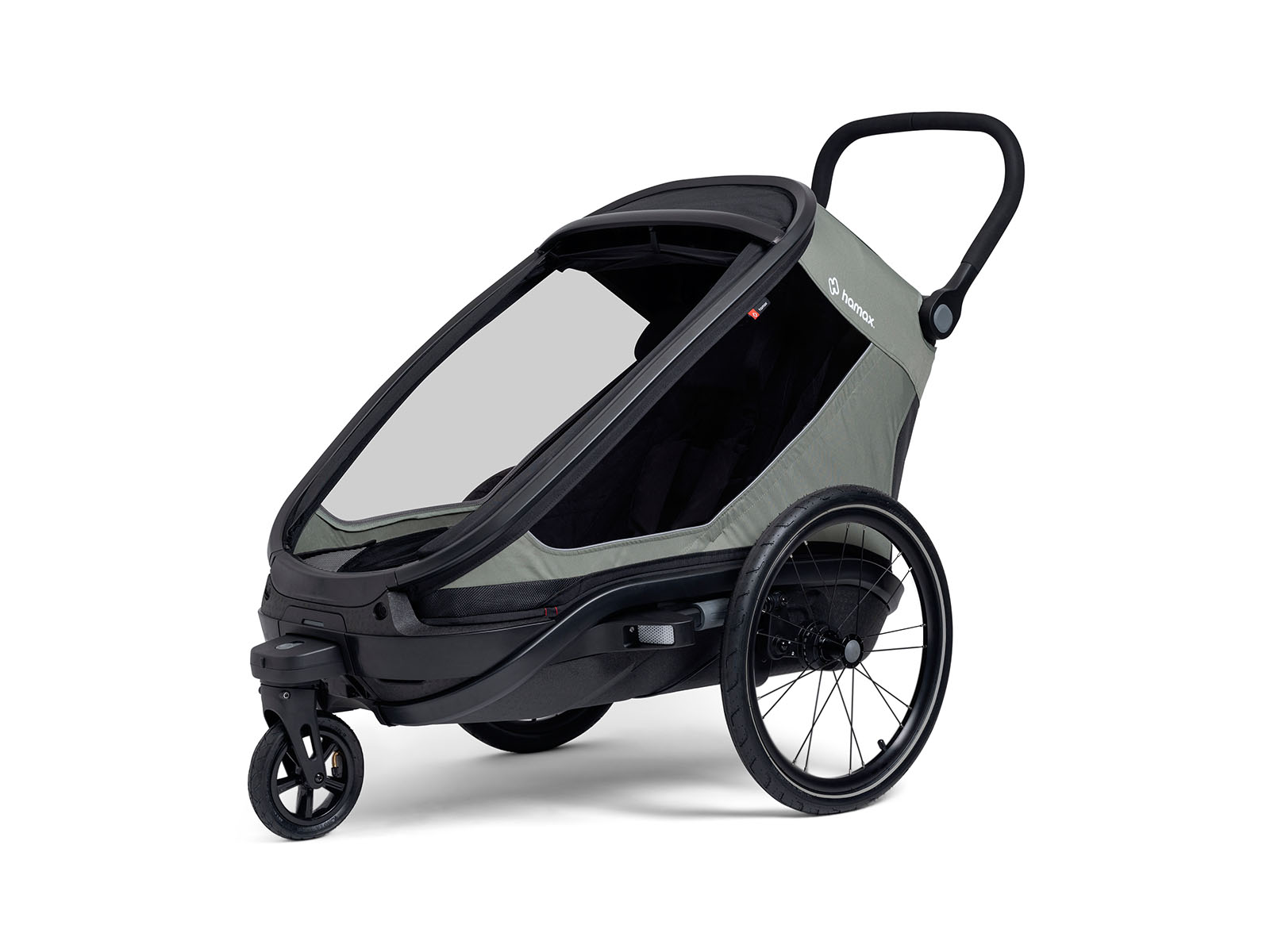 Przeprojektowany przód – przód przyczepki został całkowicie przeprojektowany dla lepszej ochrony, komfortu i użyteczności. Wymienne pokrowce posiadają teraz zintegrowaną ochronę przed błotem i żwirem, zamki błyskawiczne po obu stronach oraz centralnie umieszczone zapięcie magnetyczne, które mocuje się bezpośrednio do ramy. Solidna, wzmocniona aluminiowa rama z dodatkowym zintegrowanym pałąkiem bezpieczeństwa na górze zapewnia przestronne wnętrze i doskonałą przestrzeń nad głową, oferując najwyższe bezpieczeństwo i komfort podczas każdej jazdy.