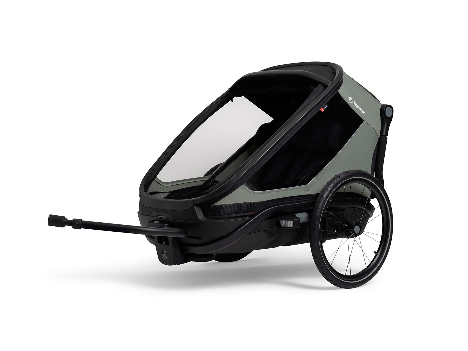 Przeprojektowany przód – przód przyczepki został całkowicie przeprojektowany dla lepszej ochrony, komfortu i użyteczności. Wymienne pokrowce posiadają teraz zintegrowaną ochronę przed błotem i żwirem, zamki błyskawiczne po obu stronach oraz centralnie umieszczone zapięcie magnetyczne, które mocuje się bezpośrednio do ramy. Solidna, wzmocniona aluminiowa rama z dodatkowym zintegrowanym pałąkiem bezpieczeństwa na górze zapewnia przestronne wnętrze i doskonałą przestrzeń nad głową, oferując najwyższe bezpieczeństwo i komfort podczas każdej jazdy.